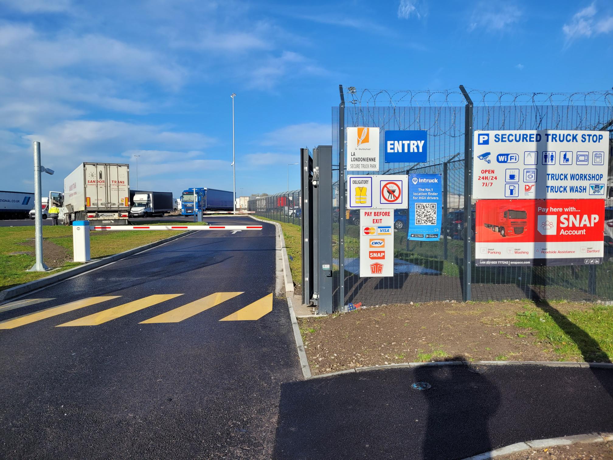 La Londonienne est un parking sécurisé dédié aux poids lourds, situé à Marck, près de Calais. Grâce à un emplacement stratégique, nous facilitons les échanges entre les principaux ports européens, tels que ceux du Benelux et de la France. Notre parking est surveillé 24h/24 grâce à des caméras de vidéosurveillance et une présence humaine constante, garantissant une sécurité optimale pour les chauffeurs et leurs marchandises.